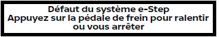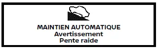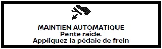 Ce témoin s'affiche et un avertisseur sonore retentit si "Avertissement Pente raide" est affiché depuis plus de 3 minutes environ. Le frein de stationnement se serre alors automatiquement, la force de freinage de la fonction de maintien de frein automatique est relâchée et le véhicule peut se déplacer ou rouler de façon inattendue. Appuyez sur la pédale de frein pour immobiliser le véhicule.