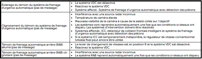 Certains systèmes d’aide à la conduite du Nissan Ariya partagent des capteurs communs tels que caméras, radars ou sonars. Si un message d’avertissement apparaît sur l’écran d’informations ou si un témoin lumineux clignote ou s’allume, vérifiez immédiatement l’état du système concerné.